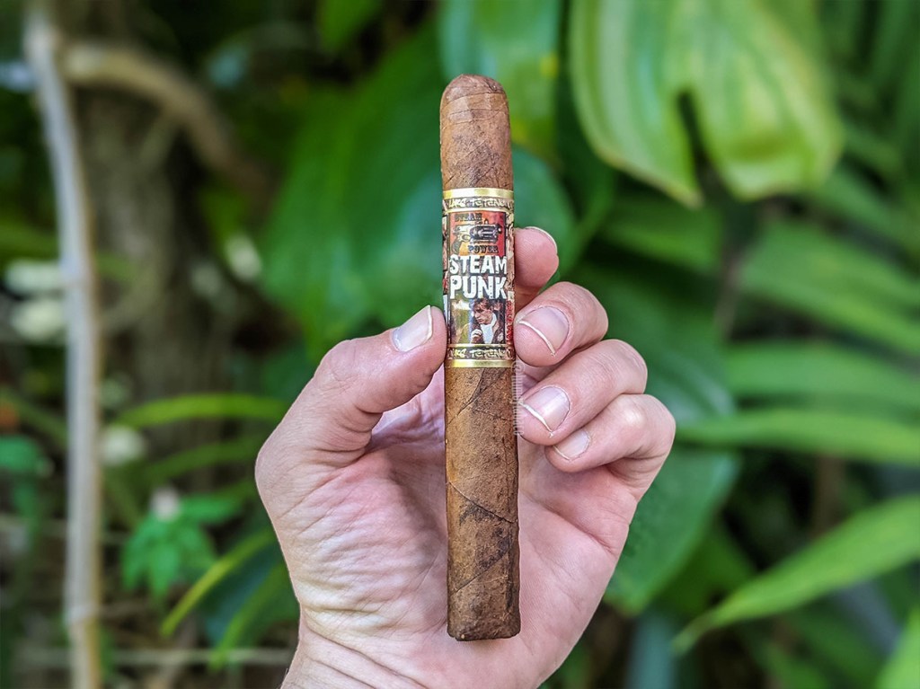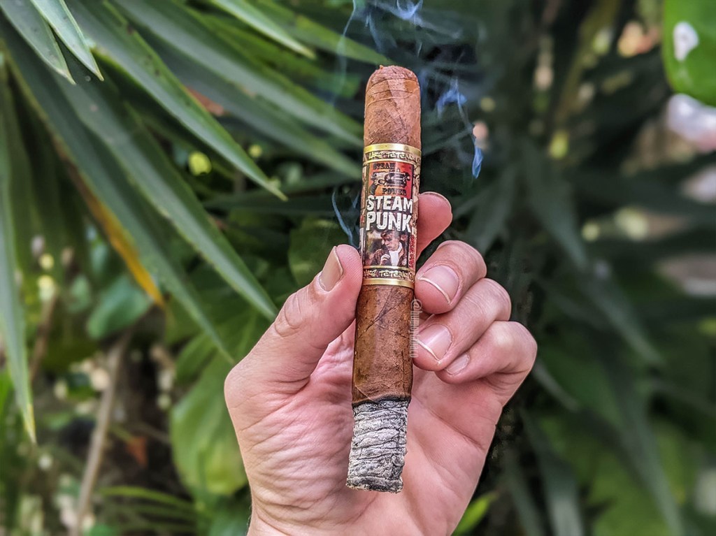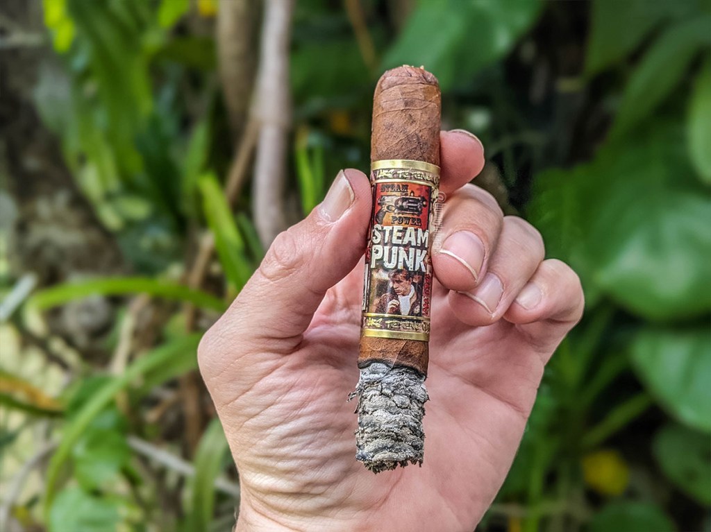 Pero pese a nombre, el Steam Punk comienza muy ligero y con notas de paja mojada, pan y almendras, que son tres sabores típicos del tabaco y que no necesariamente se siente como un cigarro saborizado. No tarda mucho en aparecer una esencia de sabores que no son los propios y que solo puedo identificar como si tomaras una rama de incienso indio y lo sumergieras en un tarro de Nutella. Precisamente, tiene sabores dulces, pero estos se sienten perfumados, como si comiera un caramelo de colonia. A lo largo del tercio no aparecen nuevos sabores, pero el cigarro afortunadamente va quemando bien, con una intensidad media y fortaleza baja.
