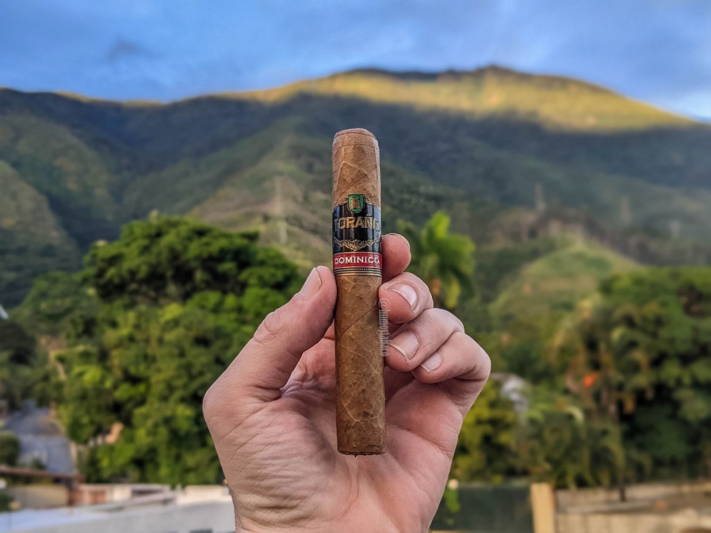 El Dominico es un robusto de capa Connecticut ecuatoriana, bastante oscura e imperfecta, pero buenos aromas. Siguiendo esa tendencia de la marca de sacar mayor provecho a lo que hacen, quizá no sea la mejor hoja pero su construcción se ve decente. Su nombre Dominico va muy relacionado con su origen, pues si bien es hecho en la República Dominicana y eso era fácil de deducir, con excepción de la capa, todas las hojas del cigarro también son de este país. La capa tiene aromas cremosos, a vainilla, paja e incluso una nota suave de madera. En el pie se aprecia una nota fuerte a tierra seca y paja, pero cuando lo pico, la calada en frío tiene notas de tierra pero más vegetal, crema y un toque suave de pimienta.