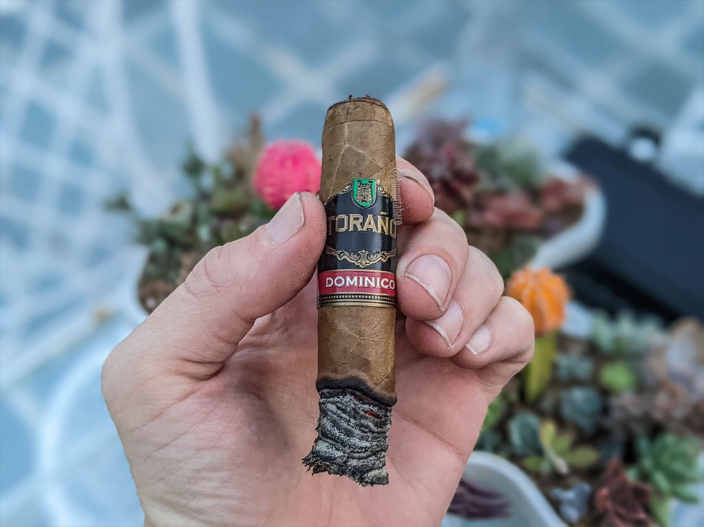 En su fase final, el Dominico concluye sin mucha pena ni gloria, manteniendo los sabores que ha tenido desde el inicio e incluye, en orden de intensidad, tierra, madera, pimienta y nueces, siendo estos dos últimos los que se sienten más en el retrogusto. El anillo de combustión mejoró, pero a fuerza de la consistencia del cigarro y, en consecuencia, esta se hizo un poco más esponjosa y le costaba más mantenerse encendido. No obstante, esto llevó a que cuando finalmente se apagó solo, aunque en teoría le quedaba un poco de fumada si lo reencendía, no me molesté en hacerlo.