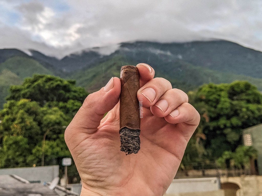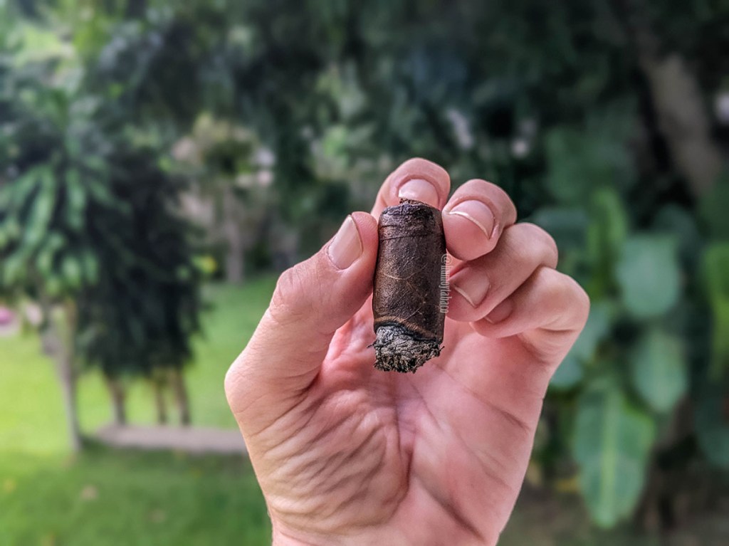 No hay grandes cambios en relación a los sabores del último tercio, pero sí hay un nuevo orden en ellos e incluso llegan a aparecer notas suaves de algunos nuevos, que incluyen un nuevo matiz de ese sabor tostado que se siente más como mantequilla quemada, e incluye cedro, pimienta y tierra. Hay algunas notas de especias tostadas, como de nuez moscada horneada, sin querer ser demasiado específico pero sí que es como cuando hay una torta de especias en el horno. La intensidad de los sabores llega a alta y la fortaleza a media-alta, pero la experiencia realmente agradable y gratificante, especialmente al marcar una hora y 45 minutos en un cigarro que esperaba finalizara unos 30 minutos antes.