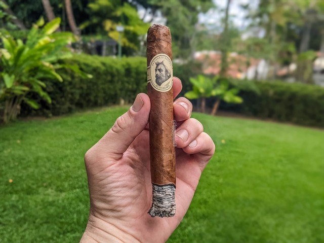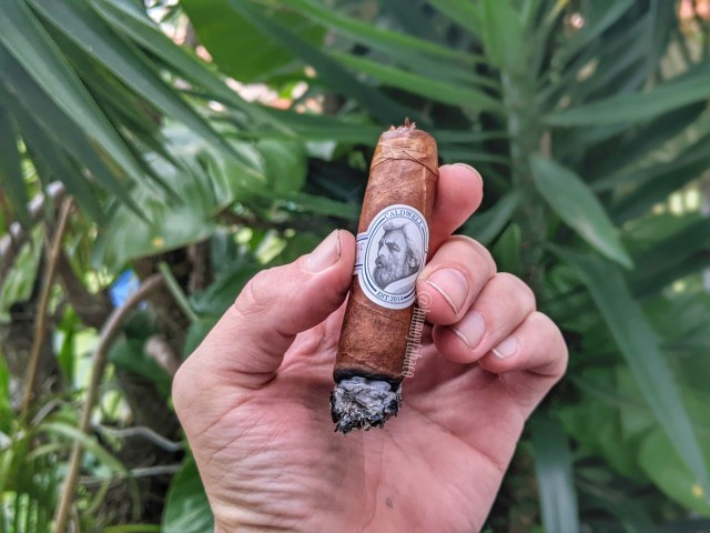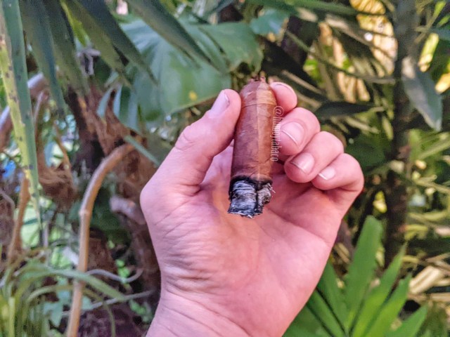 Algo que me llamó mucho la atención de este cigarro pero que no destaqué en menciones anteriores es que la capa se siente muy flexible… es como que no se rompe del todo, sino que se estira. Cuando le hice el corte para encenderlo, lo hice con una guillotina en V de corte superficial, especialmente porque sabía que no podía hacerle un corte profundo y porque esa ligereza del cigarro me asustaba un poco. Así que el corte no pasó perfectamente por el cigarro, pero sí dejó una línea como esta guillotina suele hacer, especialmente porque no va tan profundo. Pero el hecho es que quedó algo de capa luego del corte que no sabía si picar con la guillotina plana, con la tijera o simplemente dejarla (que fue lo que hice), pero fumando se fue aplanando y pegando mejor. Pero al comenzar el segundo tercio, este pedacito de capa decidió desenrollarse del cigarro y la perilla pasó a como quedó en la imagen. No pareció afectar sabores, pero la sensación fue algo incómoda. Digo esto porque el cigarro no mejoró pero tampoco pareció empeorar, con sabores a vainilla, grama, paja, madera seca y no mucho más.