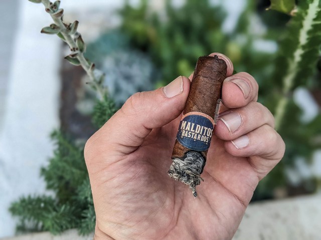 El Malditos Bastardos enciende rápidamente, aunque su tiro no es el mejor, pero con una serie de retoques rápidos puedo asegurar una quemada uniforme y mantiene esa quemada bastante bien durante la fumada. Los sabores no se hacen esperar e incluyen paja, pasas y cáscara de naranja, con notas dulces durante estas primeras caladas. Al cabo de unos 10 minutos aparecen notas de vino y cacao en polvo, mientras que el retrogusto se siente como una combinación de cuero con canela. El anillo de combustión se comporta muy bien, incluso si la ceniza tiende a «esfloretarse» un poco. Pero el humo es denso y muy rico, así que no hay problema alguno.