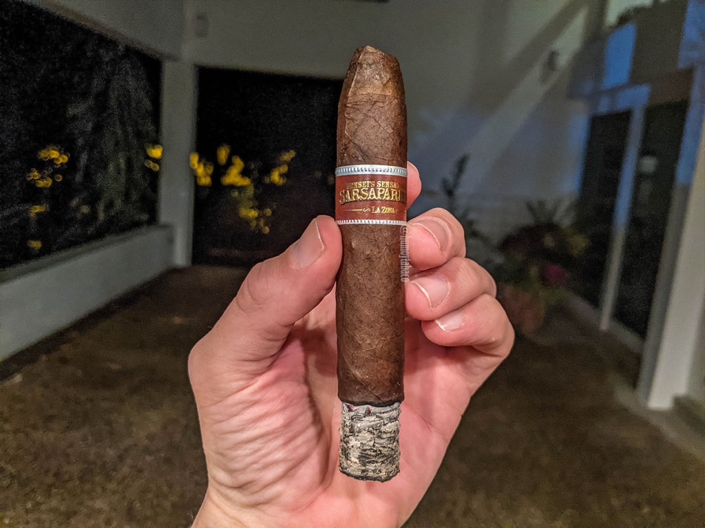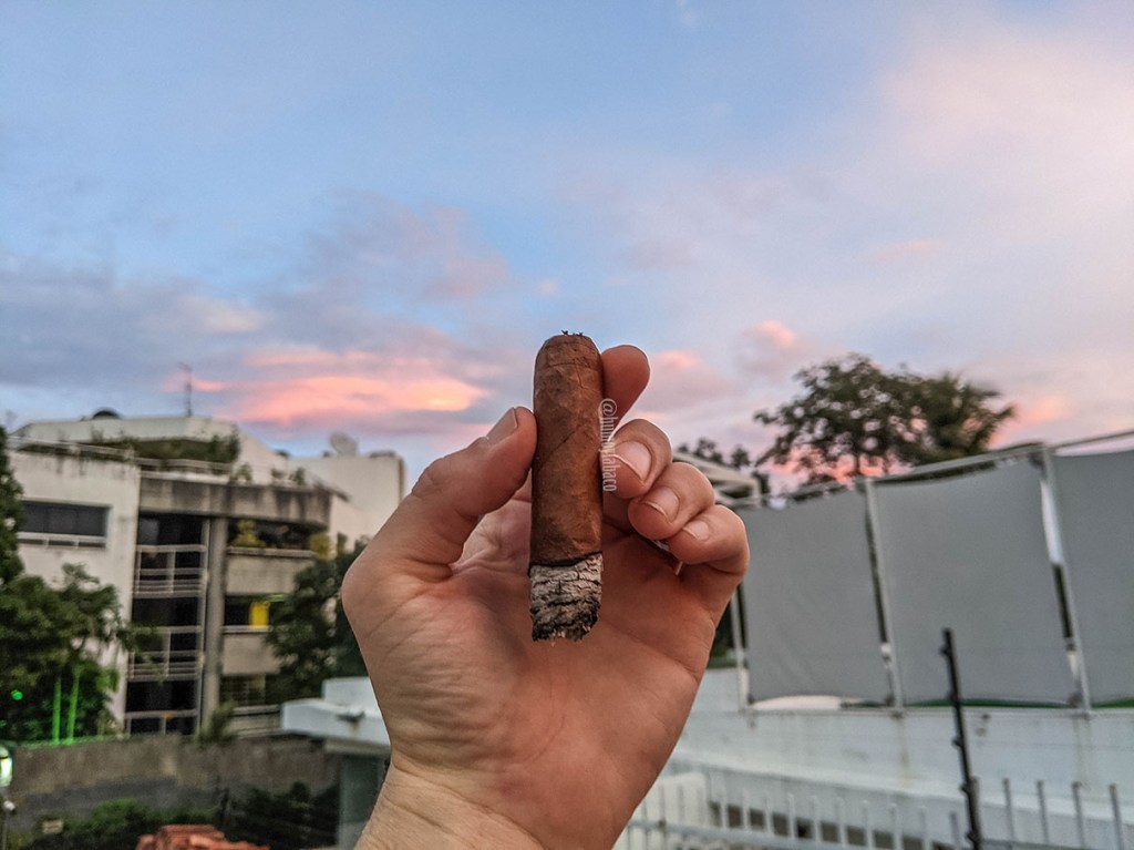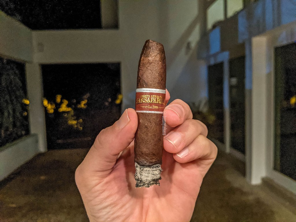 En cuanto a la construcción, que no he tocado ese tema, la razón principal ha sido porque no me ha dado problema alguno; el anillo de combustión nunca fue del todo recto, pero nunca requirió un retoque. El tiro, ligeramente más apretado de lo normal, me parece que ha permitido una dosificación ideal de la fumada y el humo ha sido abundante y denso desde el principio, por lo que sin duda merece un reconocimiento de mi parte. Los sabores en el último tercio continúan siendo más densos, algo que aprecio bastante, especialmente porque muchos cigarros tienden a perder propiedades en su fase final. Sigue mandando notas de chocolate y cítricos, y aunque la canela y vainilla se sienten mucho menos, eso no significa que los demás sabores van a disminuirse. Al cabo de una hora y 40 minutos, el Sensei’s Sensational Sarsaparilla llega a un final en el que realmente me impresionó.