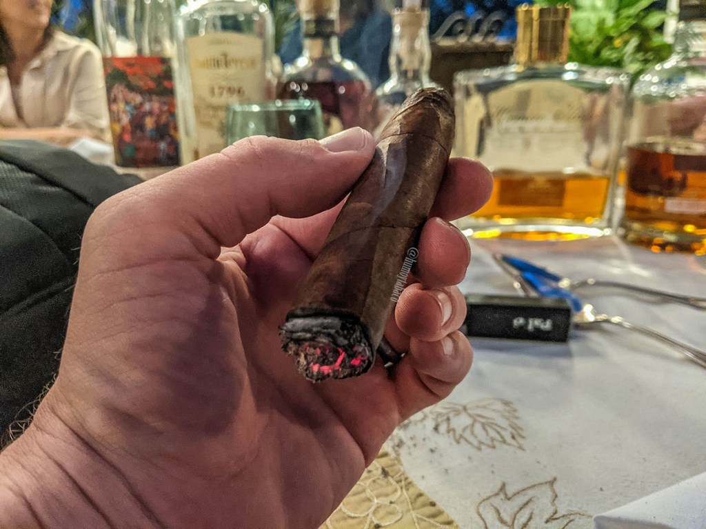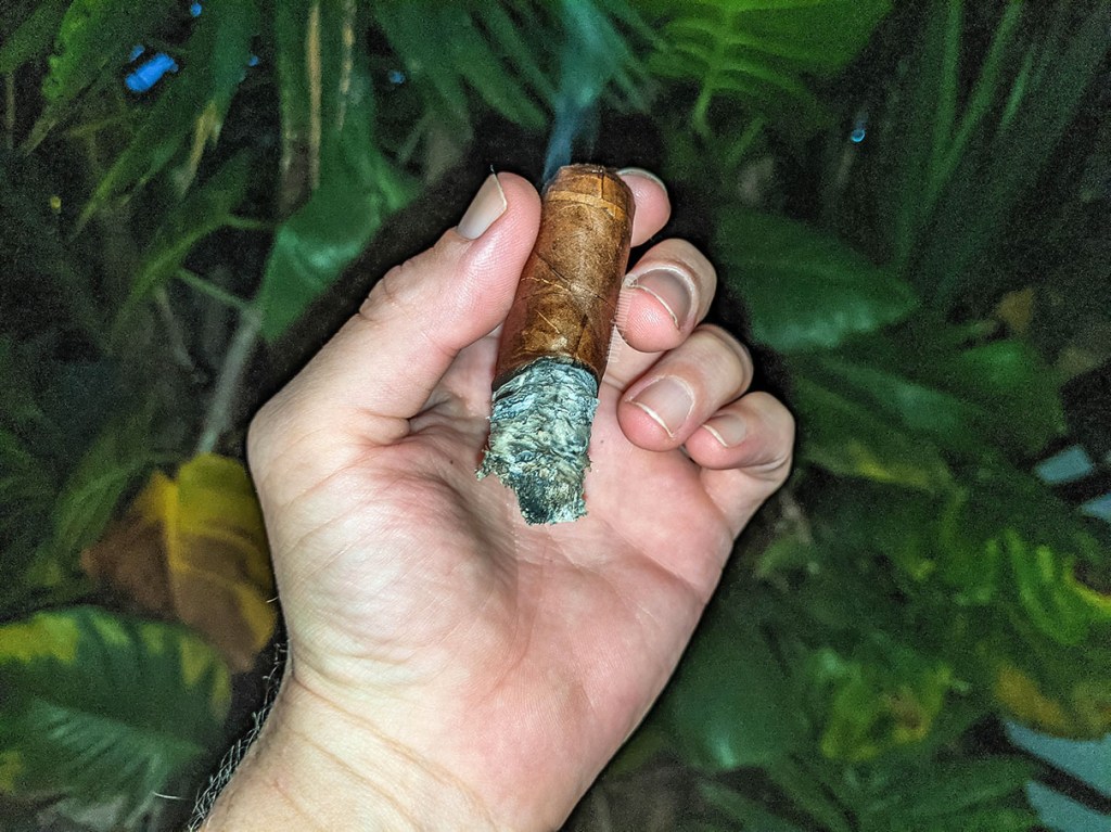 Los sabores a madera se convierten en probablemente los principales en este segundo tercio y me refiero a ellos en plural porque ciertamente se sienten dos matices distintos, uno de roble y uno de cedro, aunque no al mismo tiempo, o no siempre al mismo tiempo. Pareciera que el de cedro acompaña al cigarro hasta la mitad y después del ecuador le acompaña un sabor que se aproxima más al roble, pero también hay sabores de cuero y tierra, junto con pimienta, aunque esta no está al mismo nivel que los demás. En el retrogusto la pimienta pasó de roja a negra, pero no está sola, siendo algo de cáscara de naranja lo que lo acompaña también. Ciertamente es más complejo que en el tercio anterior y la intensidad es algo mayor en temas de sabores, pero en fortaleza del cigarro sigue siendo medio. Muy para mi sorpresa, la mayoría de mis amigos fumadores presentes están encendiendo su segundo cigarro de la tarde mientras yo me acerco a la mitad de este y, por supuesto, comienzan todos los temas de burla que si no estoy fumando o que el cigarro se me ha apagado, pero ninguna de las dos es cierta. El cigarro simplemente quema bastante lento.