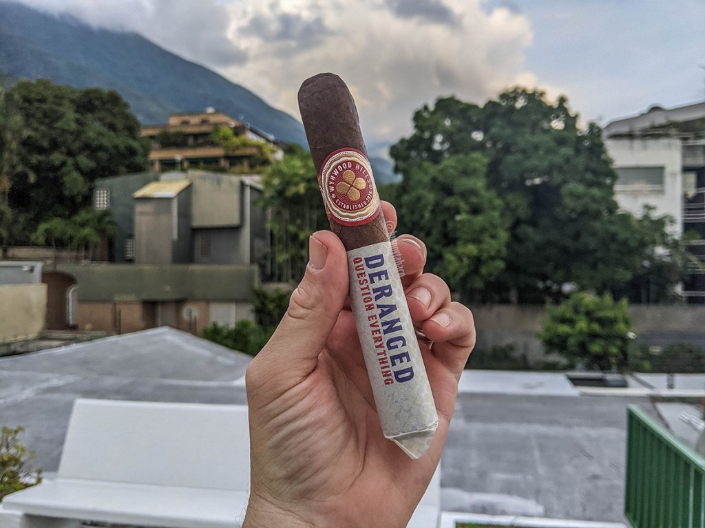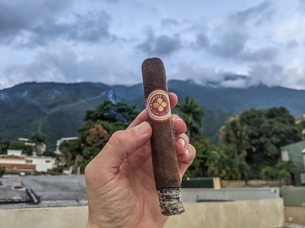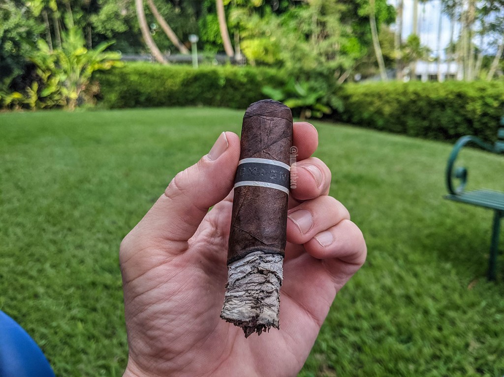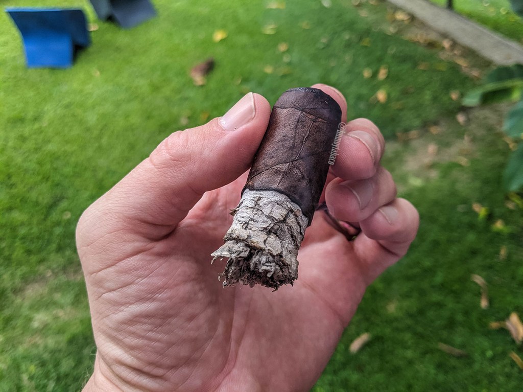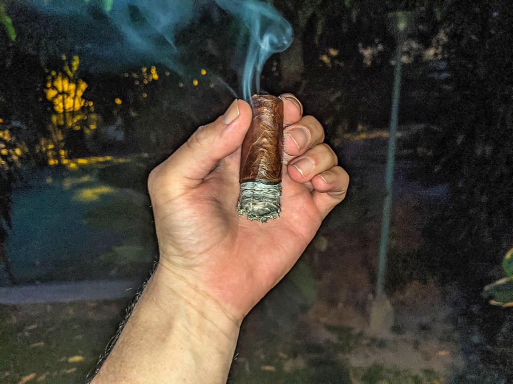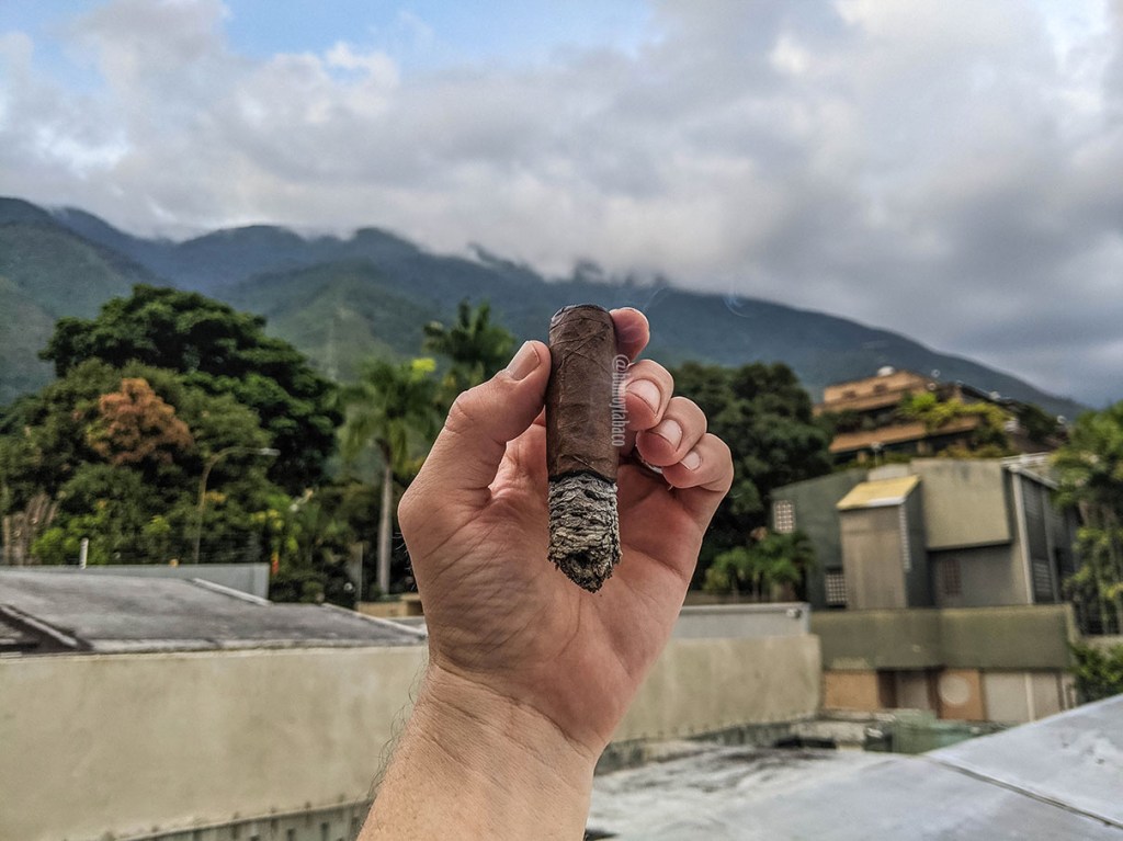 Para el último tercio los sabores predominantes son de chocolate negro y café espresso, manteniendo sin duda su carácter oscuro, humo abundante y una quemada imperfecta, pero sin problemas. La intensidad aumenta, pero no es un cigarro que calificaría como fuerte y bastante distinto a la gran mayoría de cigarros fuertes de la marca. Mantiene también su carácter brillante, quizá más notable por el flash de la cámara, pues no esperaba que me agarrara la noche fumando después de casi dos horas encendido. También hay algo de sabores de pimienta y madera, pero no a la altura de los dos principales.