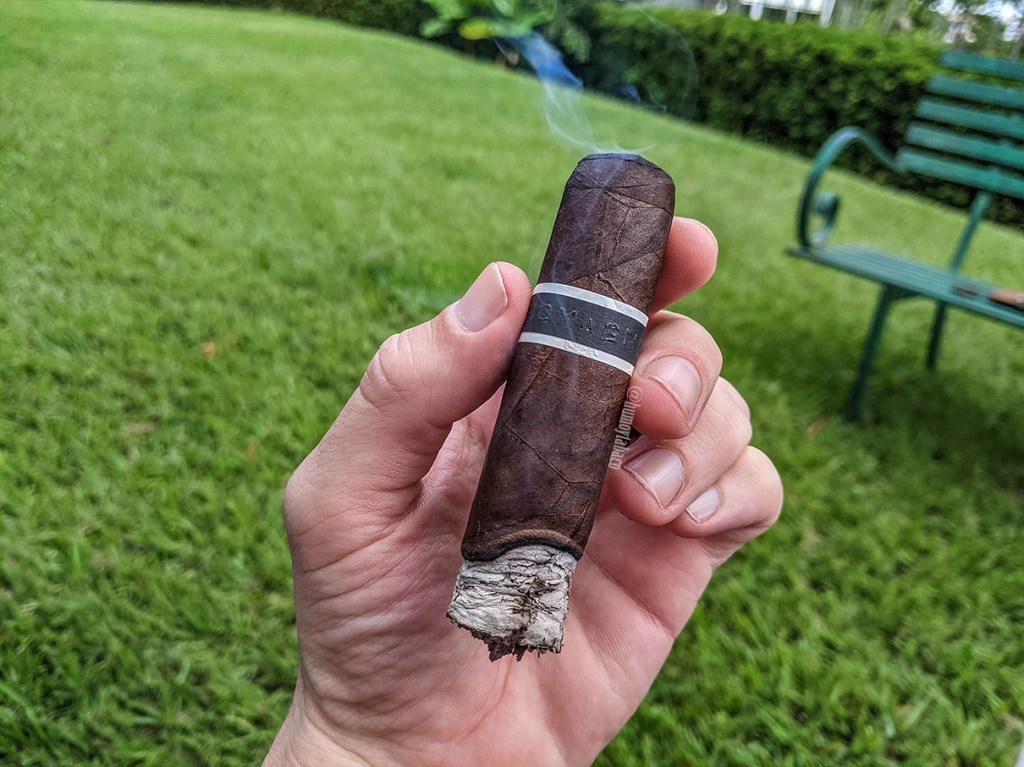 En el segundo tercio los sabores son más oscuros, destacando menor cantidad de pimienta o de sabores picantes, siendo solo el retrogusto donde hay alguna cantidad notable, pero en el paladar hay abundante chocolate negro, café y muchos menos sabores dulces que en el tercio anterior. El humo es mucho más abundante y la densidad del mismo mucho más notable, aunque es también en este tercio donde aparecen algunas imperfecciones en la construcción, pues la capa se abomba un poco justo antes del anillo de combustión, aunque eso sucedió poco antes de quemarse, así que afortunadamente no se vio mucho pero el anillo en sí ya no es tan recto gracias a ese problema. También me pasó que piqué el cigarro con la doble hojilla y la perilla se vino inmediatamente, así que en este tercio se comenzó a levantar un poco la capa, pero fue con saliva y paciencia que logré controlar eso y que no se saliera de más.