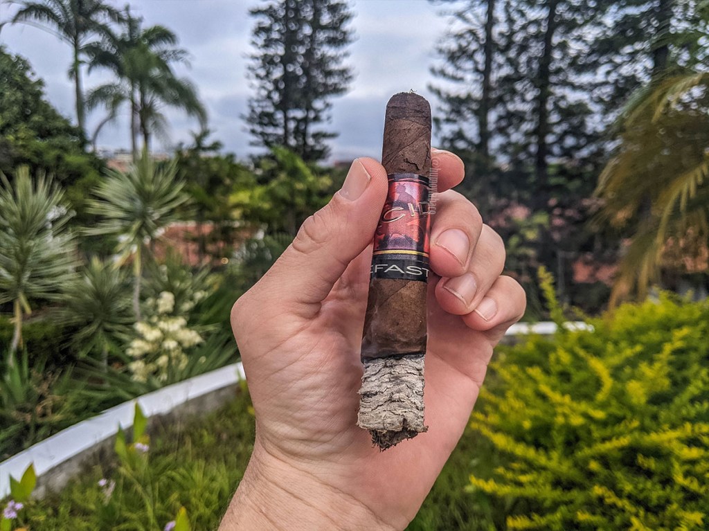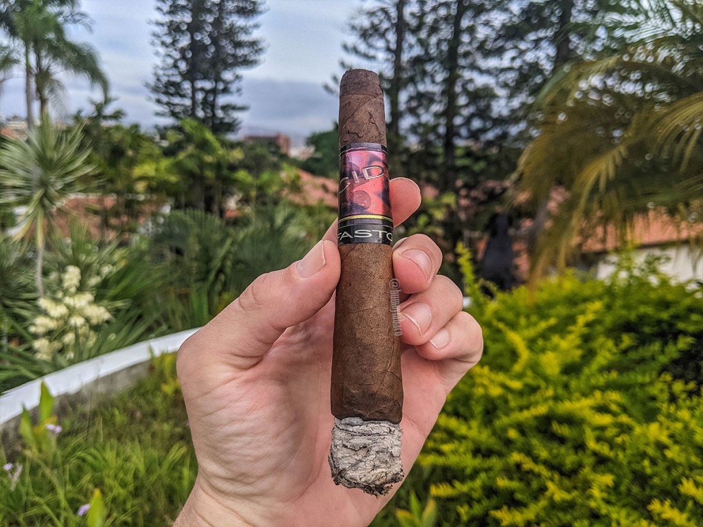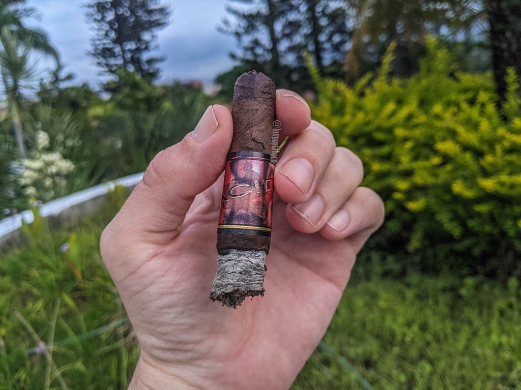 La ceniza efectivamente se mantiene muy poco sobre el cigarro y esto puede ser un tema de construcción, de cepo o que simplemente la ceniza no se aguanta mucho, cosa que pasa con algunos cigarros y no es necesariamente sinónimo de buena o mala calidad. Hay un cambio sustancial en este tercio medio y es que los sabores dominantes de cuero y tierra que dominaban el primer tercio son sustituidos por merey (anacardo para el resto del mundo) como dominante, seguido de chocolate negro, anís, granos de café y madera. El retrogusto sigue manteniendo la pimienta y es la nota dominante ahí, pero también se siente un aroma que me recuerda bastante a la melaza pero a partir de la mitad ese sabor cambia a una nota más de chocolate negro, como el que se siente en el paladar. La construcción no es la mejor, no tanto por el tema de la ceniza sino por una tendencia no a apagarse, pero si a reducir el área de quemado, por lo que requiere un par de retoques durante este tercio a fin de mantener la quemada uniforme.