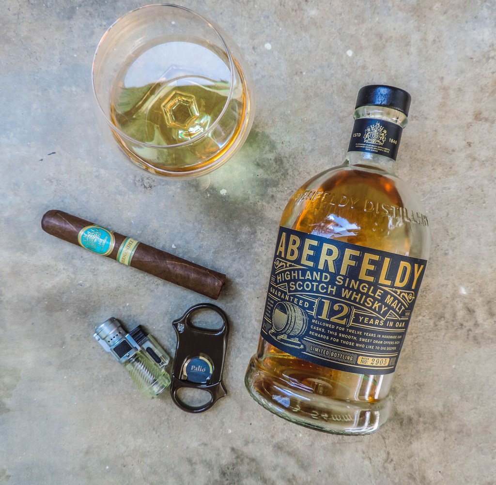 Para el pack de junio es quizá el cigarro menos conocido, o al menos por mí. El pack incluye La Dueña de My Father, un Gran Habano que no he probado todavía y un AJ Fernandez llamado Puro Especial, que tampoco. Como buena capa Broadleaf el cigarro se ve bastante imperfecto, con muchas manchas en la hoja, irregularidades e incluso algunas partes medio levantadas en la hoja, aunque eso último no es causado por el tipo de hoja. El cigarro está marca con una vitola Rothschild, pero tiene dimensiones de 5×56, que me parece una de las más alejadas del tamaño Rothschild habitual de 4,5×48 o x50 que he fumado anteriormente. El cigarro tiene un box press bastante marcado y en la capa se sienten aromas de té, chocolate y bosta. En el pie hay aromas más de té y chocolate, sin el aditivo de bosta y una sensación de pimienta que me tiene estornudando un par de veces antes de darle fuego al cigarro. Lo pico con la guillotina en V, pues estos cepos más grandes me gusta cortarlos así para asegurar una buena fumada y, muy para mi sorpresa, el tiro se siente bastante apretado, pero me permite apreciar notas de cítricos, sobre todo cáscara de limón verde, chocolate, notas suaves de café y una nota de pimienta sutil.