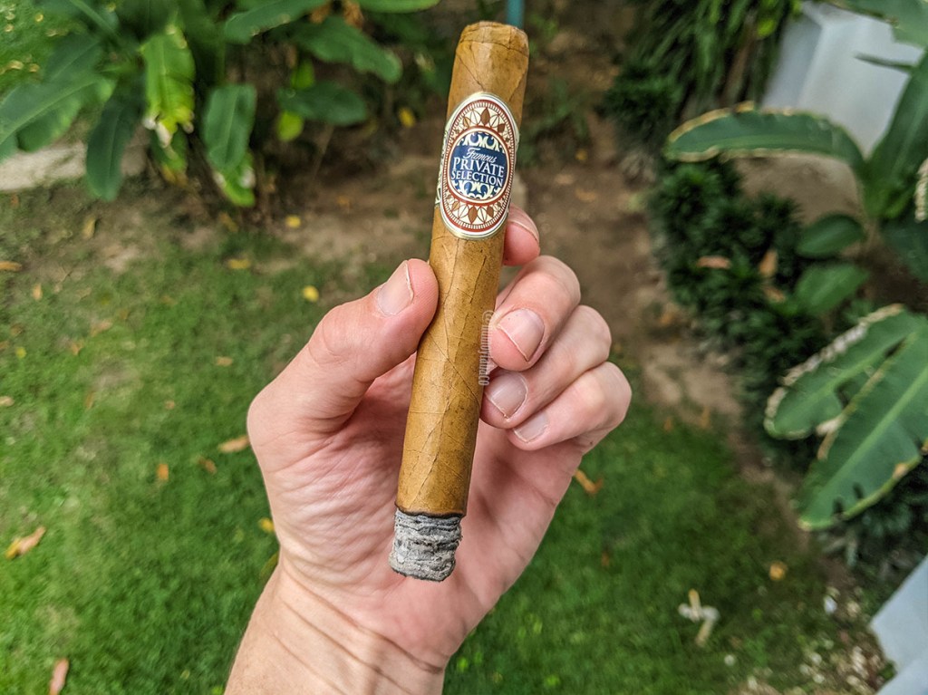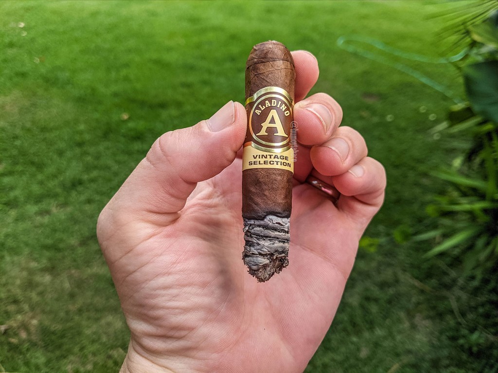 En el último tercio los sabores son los mismos, pero la intensidad de galletas y pimienta esta vez llega hasta el paladar, presentando además notas de especias dulces como nuez moscada, canela y vainilla, pero con el mismo tiro apretado, cosa que no cambió durante toda la fumada, sino que mantuvo sus sabores ricos y el humo medianamente abundante, aunque el tiro no hubiese cambiado, casi como si ese era el tiro que debía tener. Quedando unos centímetros de fumada, más o menos hasta la anilla, el cigarro se apagó y luego de dos intentos por reencenderlo, lo dejé, luego de una hora y 45 minutos de fumada.