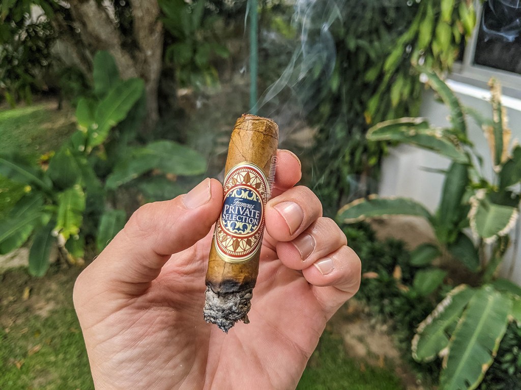 Para el segundo tercio no hay una transición destacada de sabores, manteniendo los mismos del primer tercio con el único posible cambio de una mayor complejidad en el retrogusto, en donde aparecen más notas de galletas y de pimienta, pero en general el cigarro mantiene sus mismos sabores, mientras que el anillo de combustión es generalmente recto y la ceniza tiende a aguantarse más tiempo del que pensaría en un cigarro de estas dimensiones. El tiro no mejora, lo que me lleva a hacerle un segundo corte con el fin de garantizar que no sea un tema de corte, lo cual realmente no mejora la fumada sino que me obliga a fumar igual de lento.