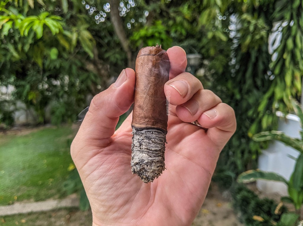 Las sensaciones del brownie quemado se sienten más malteadas en la parte del chocolate en el último tercio, pero la lengua y la garganta se sienten más secas en cada calada posterior. Más allá de eso, los sabores de madera vieja son más destacados y se siente de nuevo la tierra, que había desaparecido durante el primer tercio. La pimienta mantiene los mismos niveles durante toda la fumada y sigue haciendo que el cigarro sea parte de una gran experiencia. La intensidad llega a alta en este último tercio, justo cuando llega el momento de dejarlo, pero insisto con él y no es sino hasta que me quemo los dedos que lo dejo a un lado. El tiempo total de fumada fue de una hora y 40 minutos.