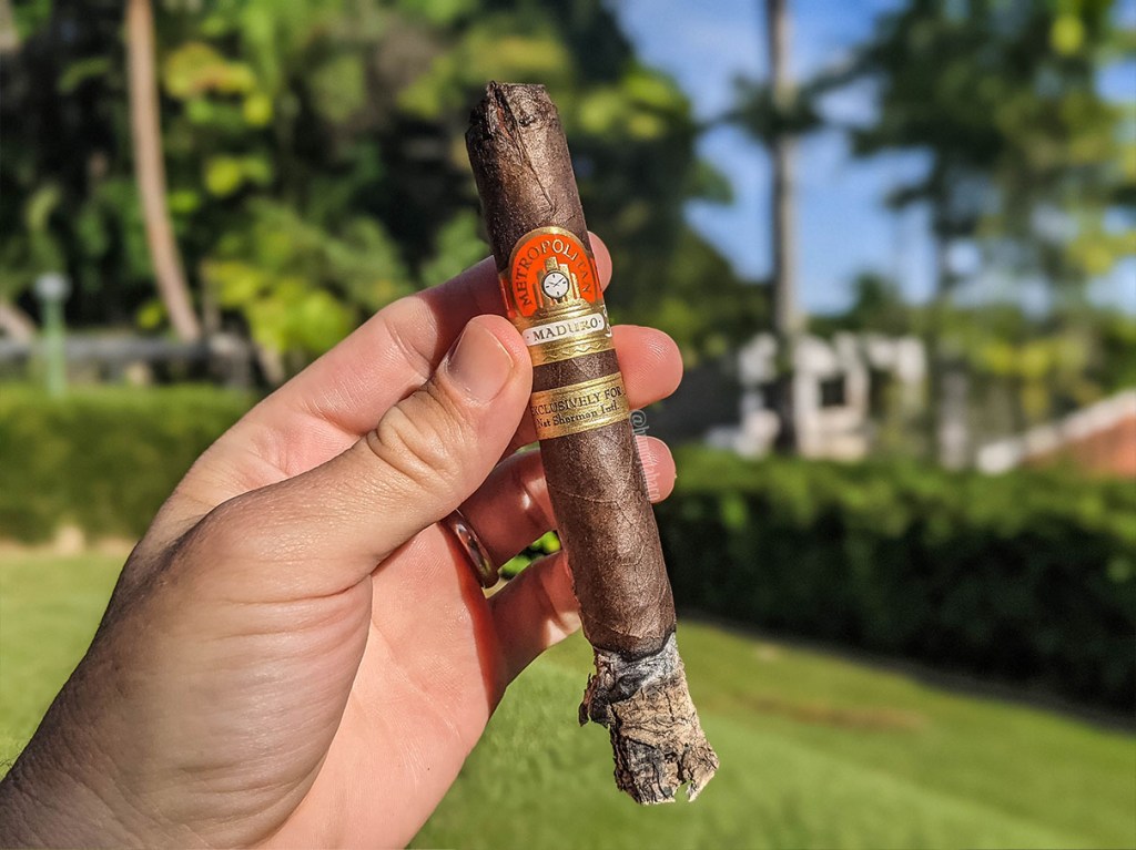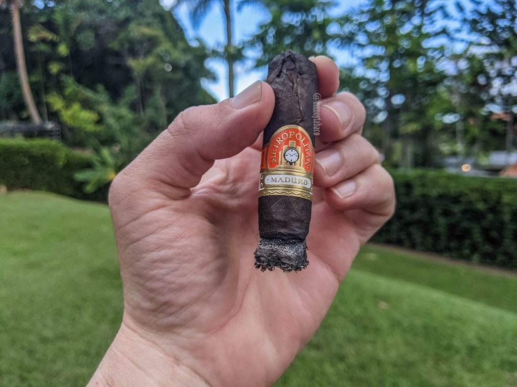 En el último tercio del cigarro comienza a perderse un poco esa dulzura y el cigarro se hace más amaderado, al tiempo que esa sensación de wasabi en el retrogusto comienza a desplazarse hacia el paladar también, pero le acompaña una nota intensa a tierra mojada que lo calma un poco y hace que el final perdure durante largo rato después de haber soltado el humo. El último tercio es sin duda el más intenso, denso y rico del cigarro, que ya es bastante decir porque así ha sido en los tercios anteriores, pero eso no evita que lo fume hasta quemarme los dedos e incluso insista en sacarle algo más. Al final, una hora y 50 minutos de fumada bastaron para acabar esta experiencia, en robusto. En toro son alrededor de 30 minutos más y en doble corona, pues no quise saberlo y se lo regalé a un amigo por su cumpleaños.
