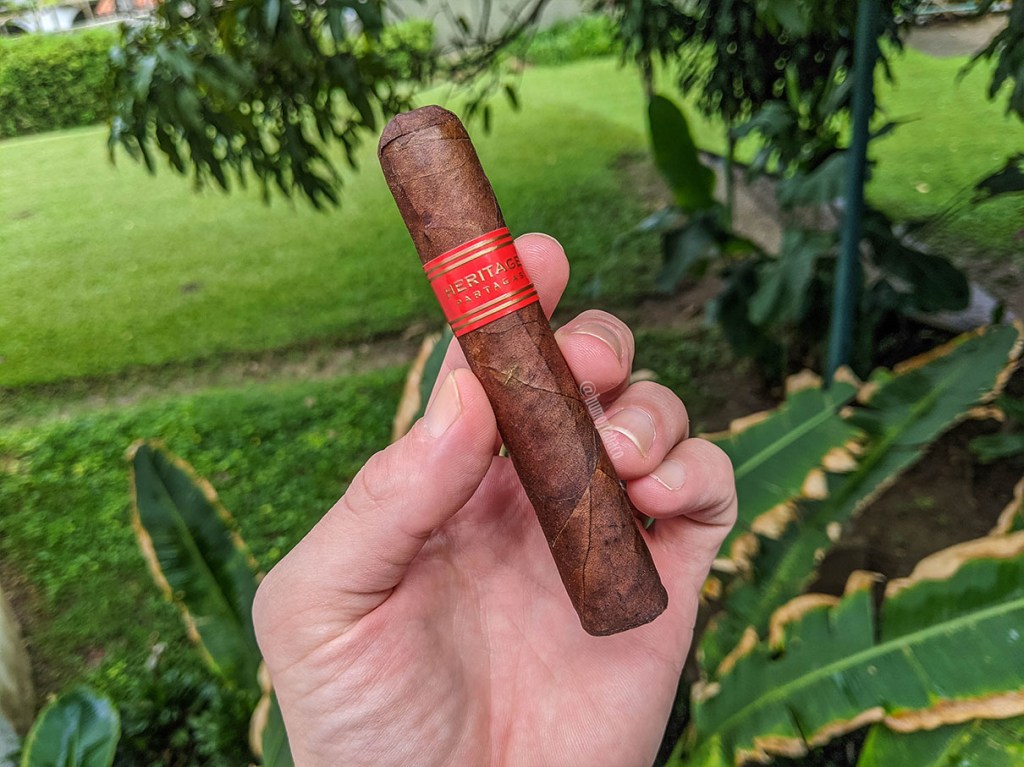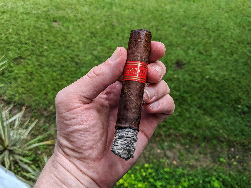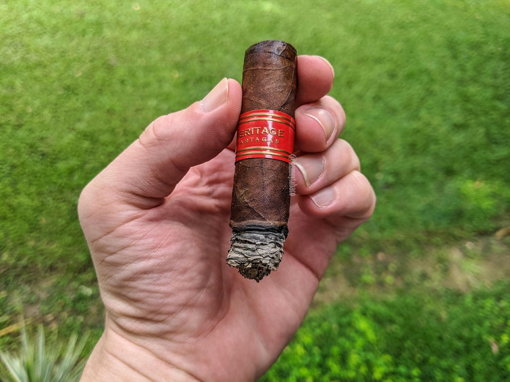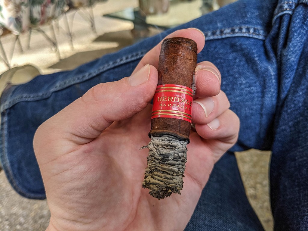 El Heritage comienza con sabores de madera, particularmente corteza de árbol, pero también hay un toque fuerte y seco que me indica que me tengo que tomar el cigarro con calma y no dejarme engañar por su pequeño tamaño. Al cabo de unos minutos desaparece esa sensación seca y el Heritage desprende sabores de pan con mantequilla, chocolate amargo, algo de guayabita y pimienta. Pese a lo que esperaba de un Partagas dominicano, este no carece de sabores ni de intensidad, con una intensidad media-alta y un anillo de combustión relativamente bueno, que no requirió retoques.