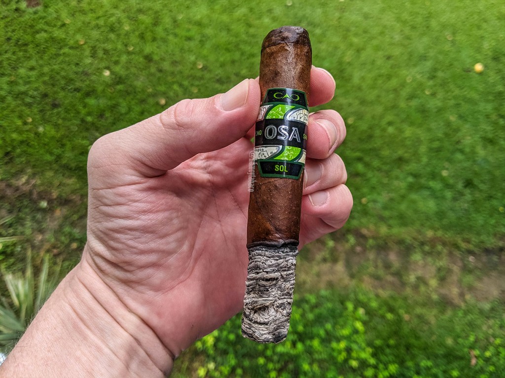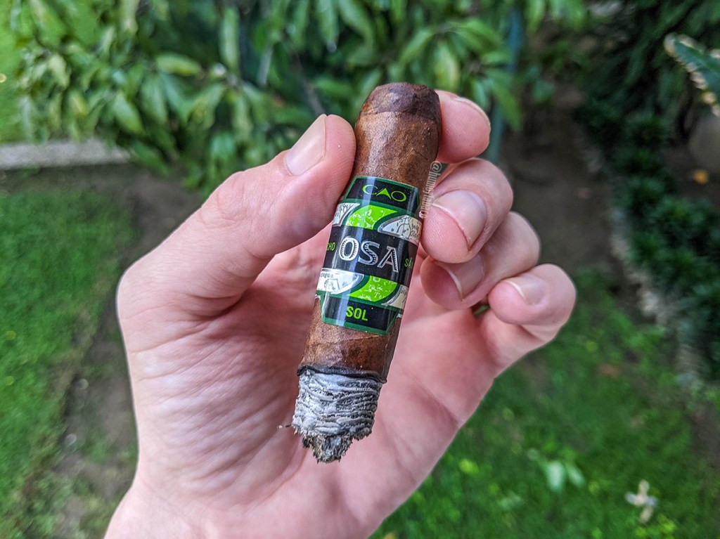 En el último tercio aparece una propiedad cremosa en los sabores y una sensación tostada con los mismos que ha tenido desde el inicio. En términos técnicos ha sido a la perfección, con un anillo de combustión que no ha requerido retoques ni ha dado problemas, humo abundante y una tendencia a mantenerse encendido, incluso con mi fumada pausada y sin apuros, que he explorado últimamente. Al final, luego de una hora y 40 minutos de fumada, el OSA SOL finalmente termina cuando no quedan ni 2 centímetros de cigarro.