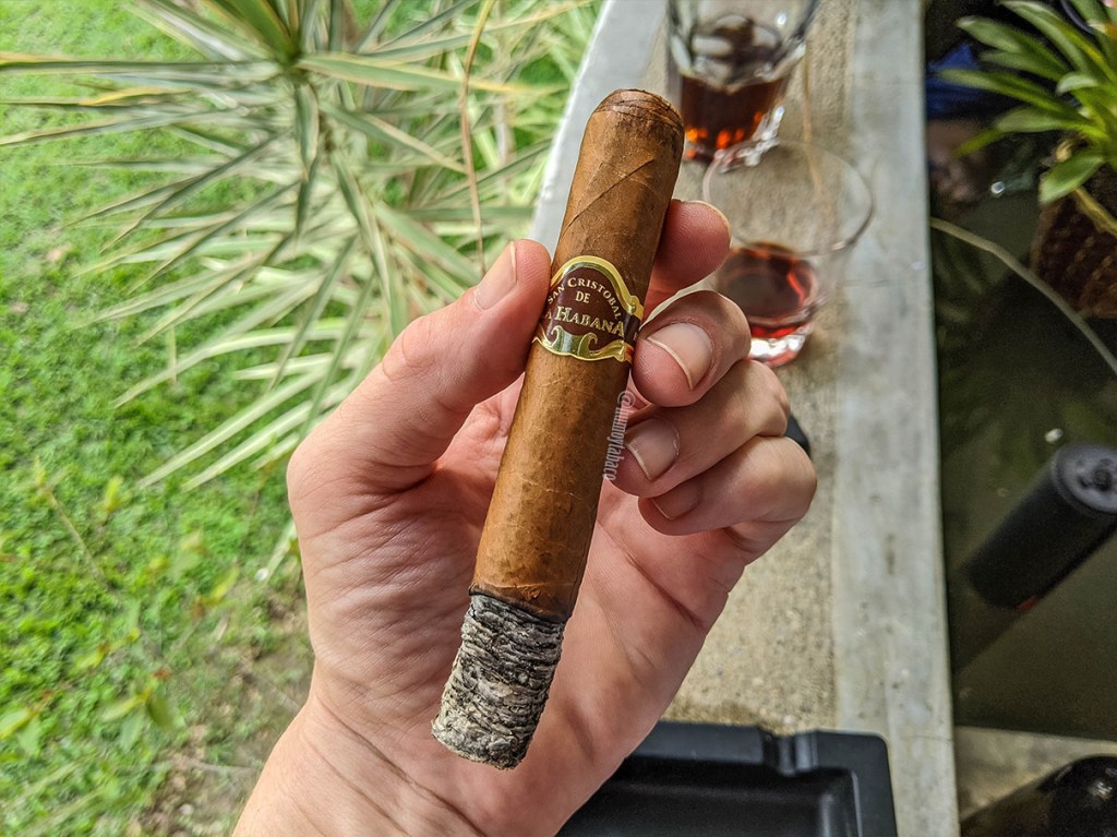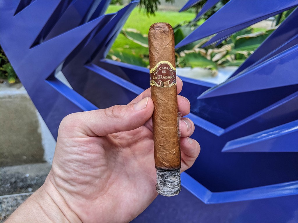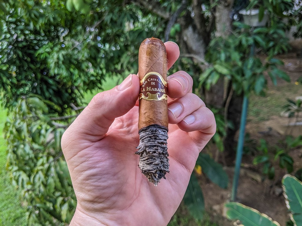 Las primeras caladas del Número Uno son un poco preocupantes, pues casi ninguno de los sabores de la calada en frío parece existir en caliente. Hay una combinación suave de maní con cuero, pero no mucho más durante los primeros centímetros y me quedo pensando si los dignatarios que reciben estos cigarros estarán contentos con su obsequio o si solamente lo agradecen y luego lo dejan en el primer matero. Eso sí, el tiro es excelente y la densidad del humo muy interesante. Sin embargo, para cuando hago la imagen el cigarro parece despertar y comienza a mostrar también sabores de canela, madera, café, tierra y cítrico. El pan que se sentía en frío está presente en el retrogusto pero más como un pan dulce, pero bastante leve. Ese retrogusto también tiene café y la intensidad del cigarro se coloca en media desde ya.