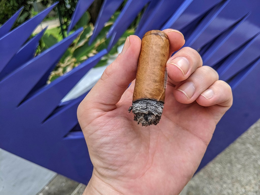 Últimamente me ha pasado con algunos cigarros que tienen un primer y segundo tercio muy buenos y en el último pareciera que se pierde la ilusión. Afortunadamente el Número Uno no hace eso y en el último tercio mantiene la misma calidad que en el anterior, aunque con sabores muy parecidos, como esa combinación de maní y cuero, seguida ahora muy de cerca por sabores de chocolate, paja, vainilla, canela, tierra, cítrico de limón y ahora clavo. El caramelo que sentí tan fuerte anteriormente ahora solamente se ubica en el retrogusto, pero también hay una nota de pimienta suave, que simplemente potencia el caramelo. En temas técnicos la construcción, quemada y tiro han sido perfectos y mantienen esa perfección hasta que marco una hora y 40 minutos, que es cuando finalmente dejo ir al cigarro.