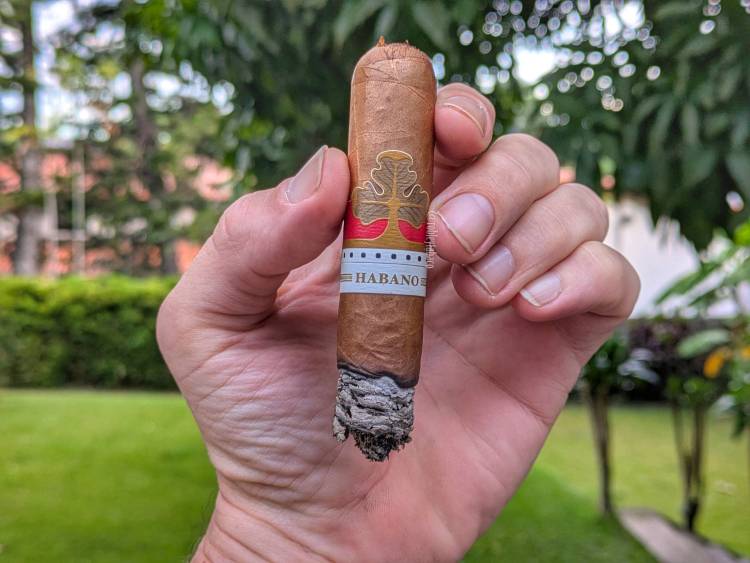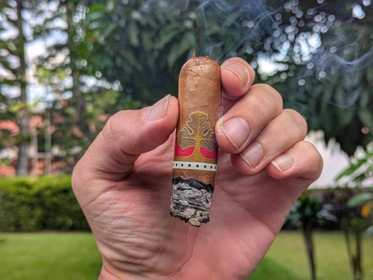 En el último tercio los sabores se simplifican un poco y si bien están casi todos, ese sabor de roble se siente más como un sabor de madera y el de café ya deja de tener propiedades que podrían haberse inclinado hacia granos de café o una bolsa de café, y el cuero ya es genérico y no es exactamente un tipo de cuero. Siguen los sabores de tierra y de pimienta también, con un retrogusto que es principalmente de pimienta, pero también de cuero. La quemada vuelve a ser muy buena, el humo denso y la intensidad media-alta, pero la fortaleza llega a ese punto también. Me toma una hora y 50 minutos fumar este Robusto (extra) hasta el final.