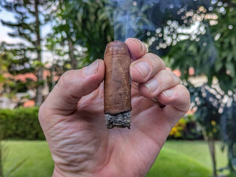 Tengo amigos que no se fuman el último tercio del cigarro. Dicen que ya para ese punto están saturados o que simplemente no les gusta tanto y si yo fuera uno de esos, el Prensado Lost Art sería un cigarro extraordinario, pero no lo soy. Efectivamente, en el último tercio de este cigarro la experiencia no es tan agradable. Esa ausencia de pimienta que ha tenido el cigarro hasta el momento se mantiene, pero en algunos casos esa pimienta sirve para tapar sabores que pueden ser desagradables y que no siempre se sienten. Precisamente, hay sabores como ácidos, de hoja que no fue bien curada y se sienten principalmente en la parte trasera de la lengua, pero además hay una sensación muy intensa de nicotina que no me agrada en lo absoluto y es una combinación muy mala para el cigarro y para el fumador. Tanto, que al poco rato lo tuve que dejar, luego de una hora y 20 minutos de lo que estaba siendo una fumada muy decente.
