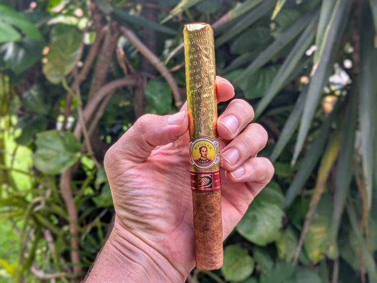 Es bastante obvio que el cigarro no se puede fumar con el envoltorio dorado, pero al quitarlo se lleva las dos anillas que están puestas sobre él, por lo que durante toda la fumada estas anillas siguen pegadas (no se desprenden totalmente) pero bailan sobre el cigarro. La capa del New Gold Medal es bastante irregular y marmoleada, pero se ve uniforme y tiene aromas sobre la capa de orejones de durazno, melaza y pretzels. En el pie hay notas ligeramente dulces y algo que me recuerda al corcho de un ron, y la calada en frío, que tiene un tiro muy respetable, tiene aromas muy similares, con la adición de cáscaras de maní.