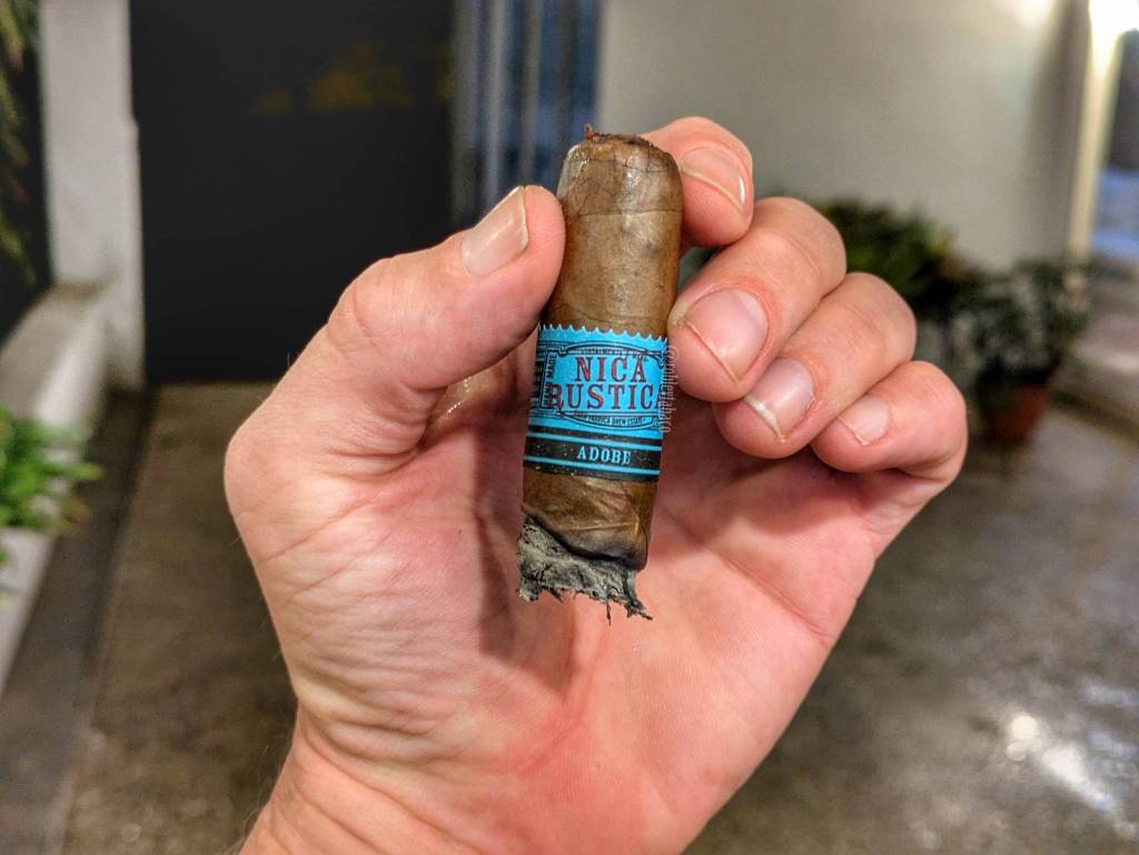 El sabor principal del Nica Rustica Adobe en el último tercio es de roble, mientras que los sabores de café de especialidad, porque sencillamente no son de café tradicional, se colocan entre los secundarios, acompañando las notas dulces y de pimienta. No hay grandes cambios adicionales en el último tercio y la quemada sigue siendo rústica, pero no da problemas en ningún momento. Esta tendencia se mantiene hasta que comienzo a quemarme los dedos, que ya han transcurrido 105 minutos desde que lo encendí (1:45 si no quieres hacer el cálculo), con un excelente tiro y humo abundante en cada calada.