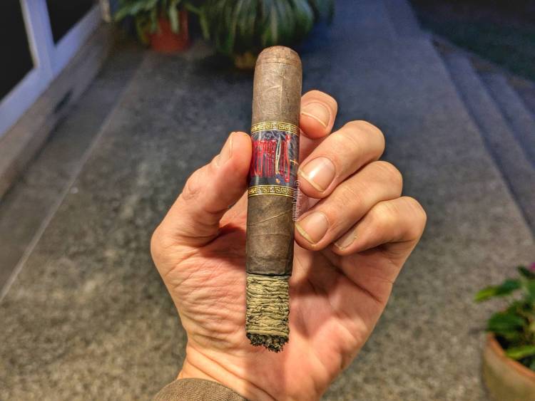En esta versión de Stallone, el Bucephalus es una edición limitada disponible únicamente en vitola Super Toro con medidas 6½ x 52, con una capa Habano madura (porque el caballo original era negro) de Nicaragua, que ha sido añejada en barricas ex-ron durante 5 años. El capote es igualmente de Nicaragua, mientras que en la tripa incluye tabacos de Nicaragua pero también de Grecia, de un varietal conocido como North Macedonia. Se trata de un cigarro oscuro y de capa algo lisa pero igualmente venosa, con aromas a melaza, roble, azúcar morena y establo, mientras que en el pie hay aromas de chocolate, principalmente. Lo pico con un punch porque de verdad que quiero probarlo en caladas pequeñas y me encuentro con una calada en frío que me da aromas de chocolate, azúcar morena (o algún componente dulce) y establo.