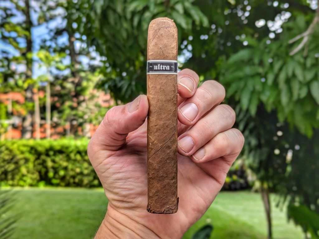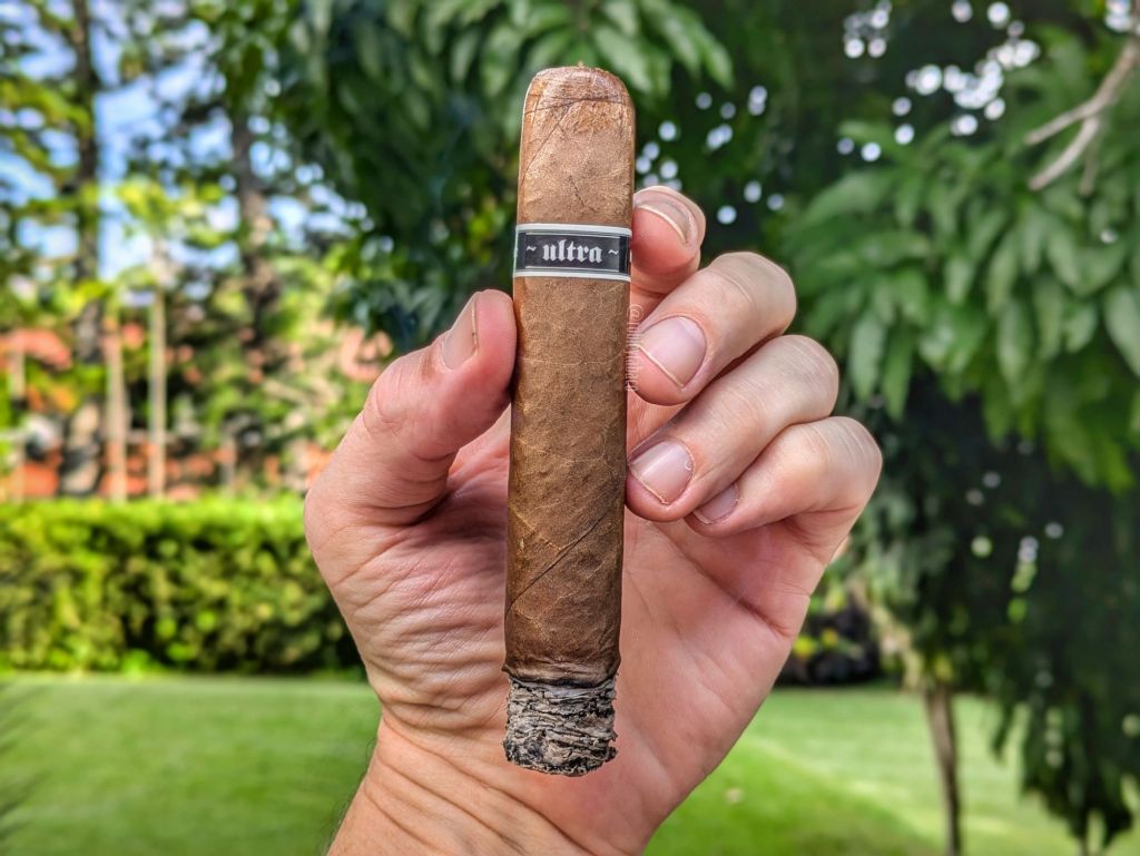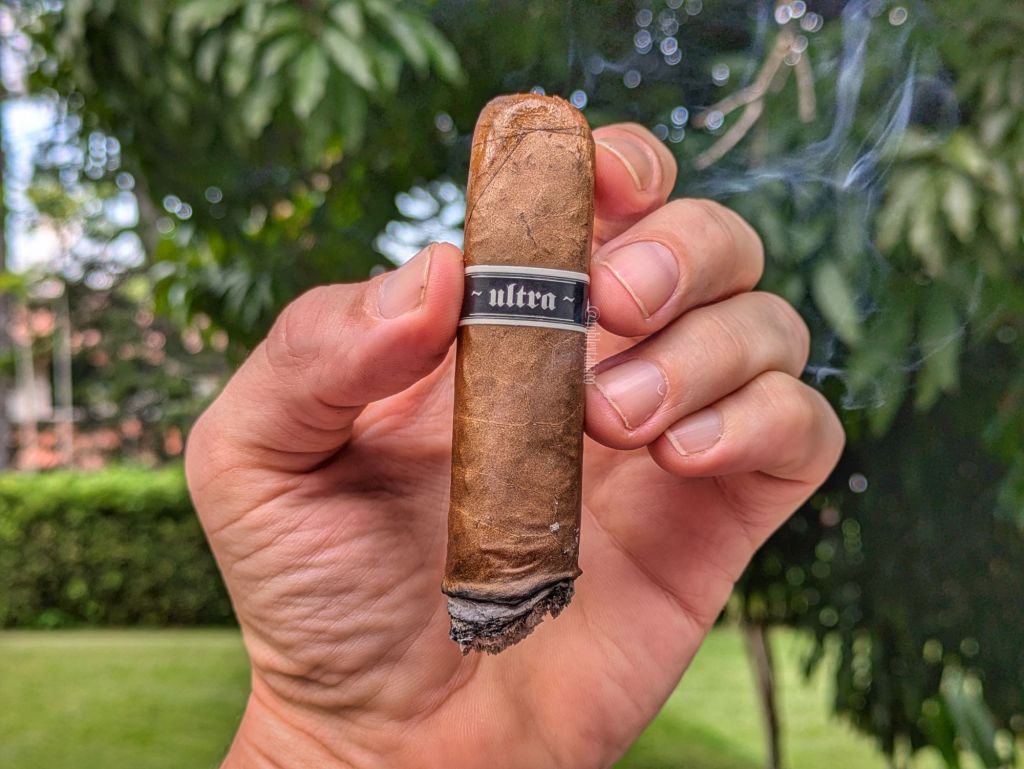 Los más observadores notarán que el pie de este Ultra no está perfecto y la verdad es que después de tres años dando vueltas en mi humidor, es normal que algo haya sufrido, especialmente si no soy el más cuidadoso de los usuarios. También hay un pedacito de capa que parece ligeramente levantado del lado derecho del cigarro en la imagen y ese es mucho más notable con el cigarro en la mano. Pero de resto este Ultra se ve maravilloso, con una capa con múltiples venas y distintos colores y la promesa de mucho sabor si mantiene su tendencia que me ha cautivado antes. Tiene aromas frutales y de tierra húmeda y algo como chocolate en polvo sobre la capa, con una sensación algo picante también. Cuando lo pico, la calada en frío denota un toque ligeramente apretado, pero algo esperado con lo pesado que es este cigarro y aromas a mantequilla, tierra y pimienta. Ahora a darle fuego porque realmente tengo muchas ganas de probarlo.