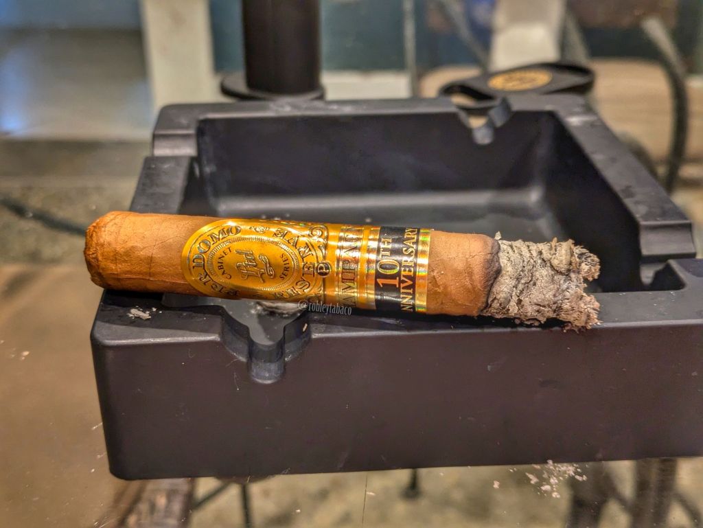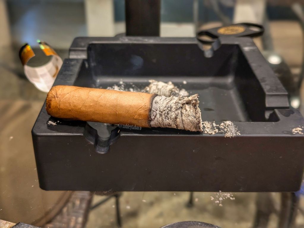 Los sabores en el segundo tercio no son muy distintos a los del primero, pero hay que considerar que esos de chocolate y café tomaron mucha más intensidad, pero también la pimienta se ha fortalecido, así que simplemente se siente más fuerte y la fumada parece haber subido un nivel. No obstante, los sabores parecen haberse amalgamado un poco y esas sensaciones de tierra son las primeras que se van perdiendo dada la intensidad de todos los demás, especialmente al superar la mitad del cigarro. Pero esos sabores de pasas se mantienen, aunque más inclinado a la parte dulce que a la frutal. Adicionalmente, cuando supero el ecuador del cigarro hay notas de frutos secos, que podrían ser almendras, pero coloco como simplemente algo genérico, al menos en este momento. La ceniza no se sostiene durante mucho tiempo y eso hace que el cigarro queme un poco más rápido gracias que la ceniza no mantiene la temperatura constante y comienza a quemar un poco torcido.