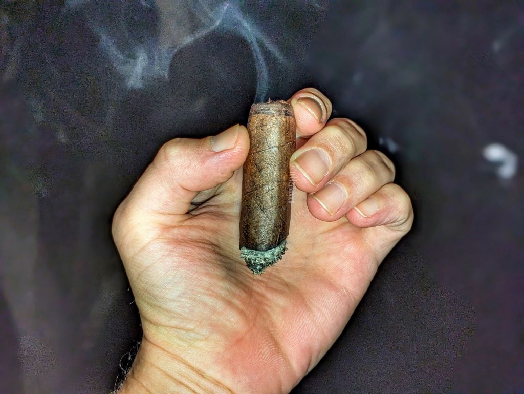 Tal fue mi emoción a la hora de finalmente probar este cigarro, que se me olvidó hacerle una foto apagado. Así que procedo con la descripción sin imagen: esta capa no es perfecta y ata un poco con ese estilo ligeramente rústico de la marca, con anillas muy sencillas que no dicen el nombre del cigarro por ningún lado. Pero la capa no es irregular, sino que es rústica y poco lisa, con varias venas, con aromas dulces y de cuero y establo. La calada en frío me da una sensación que va a ser un cigarro apretado, pero logro apreciar notas de chocolate, galletas danesas y un toque de pimienta.